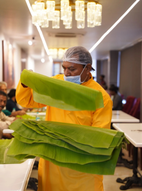 Guests sit together in long rows (called “banthi” in Telugu), symbolizing equality, unity, and community spirit — a true reflection of South Indian hospitality.