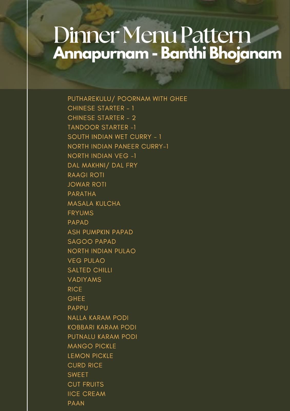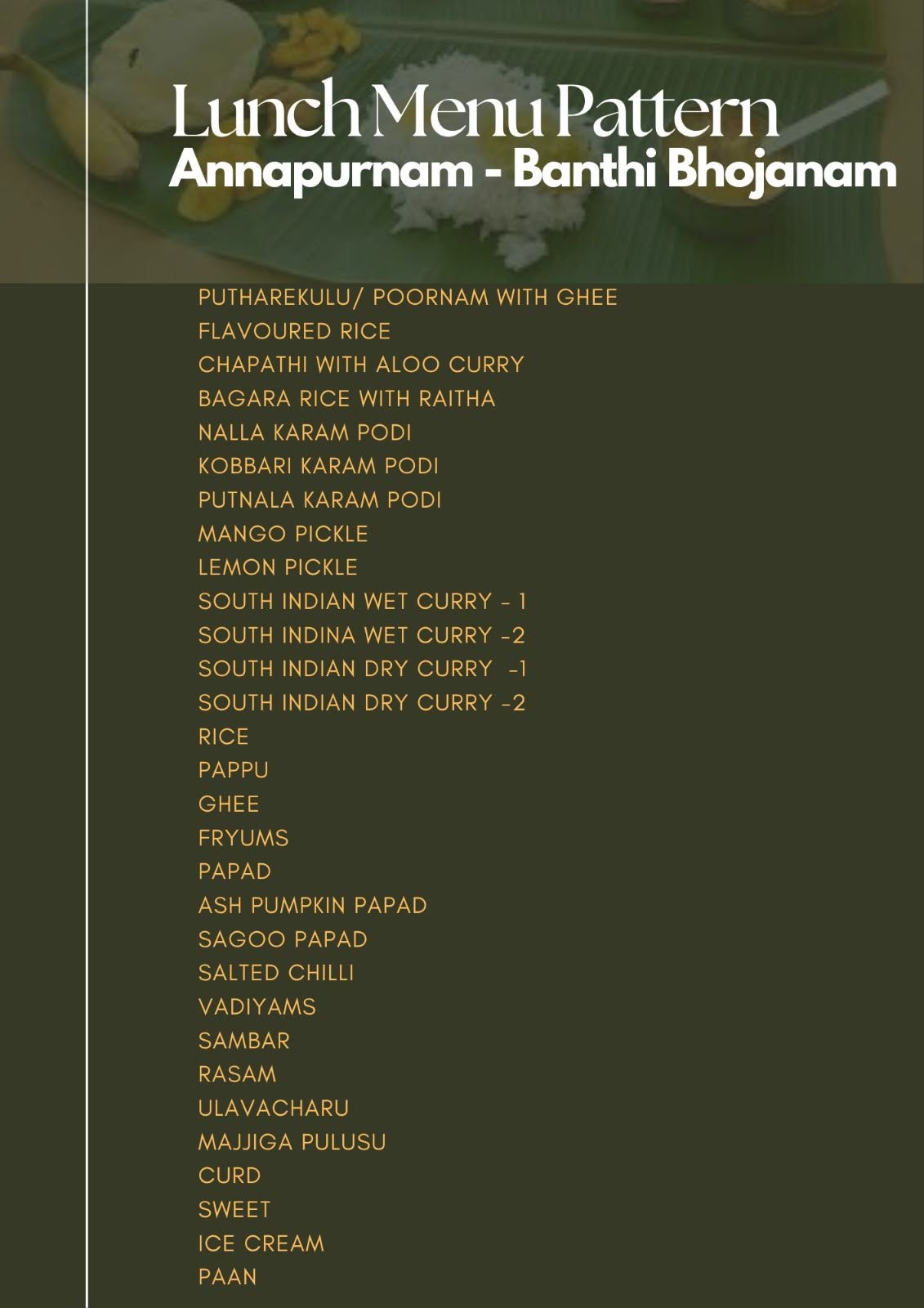 Annapurnam invites you to experience the joy of an authentic Banthi Bhojanam — a grand vegetarian feast served unlimited, celebrating the soul of Andhra cuisine on a banana leaf.